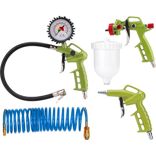 alap légkompresszor tartozék szett, 4db (lefúvató piszt. festékszóró, abroncsfúvó piszt.,spiráltömlő) 1/4" gyorscsatl.
