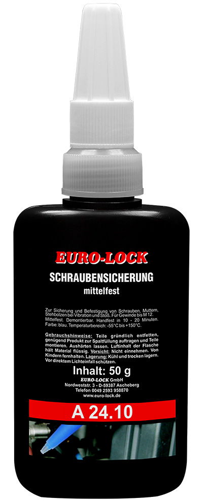 Az A 24.10 termék a csavarok rögzítésére szolgál rezgések és ütések esetén. Közepes szilárdságú, normál szétszerelhetőségű. Nagymértékben ellenáll a hőnek, korróziónak, rezgésnek, víznek,gáznak, olajnak, szénhidrogénnek és számos vegyi anyagnak. Termék: Anaerob fémragasztóKémiai alap: metakrilát-észterSzín: kékViszkozitás: 300-700 mPasSűrűség (25°C): 1,05 g/mlLobbanáspont: 100°CKeményedési rendszer: AnaerobKézi szilárdság: 10-20 percFunkcionális szilárdság: 1-3 óraVégső szilárdság: 5-10 óraNyomónyírószilárdság: 8-12 N/mm²Szakítónyomaték: (ISO 10964): 10-15 N.mTartós nyomaték (ISO 10964): 12-16 N.mHőmérséklet-tartomány: -55°C és +150°C közöttMenetes csatlakozások: M12-igRagasztási hézag: legfeljebb0,10 mmSzavatossági idő: 1 év A vizsgálati értékek acél/acél (szerkezeti acél) csavarkötésre vonatkoznak.