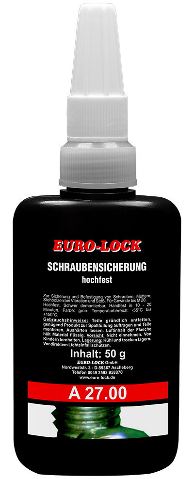 Az A27.00 egy univerzális termék menetes csapok rögzítésére és tömítésére. Nehezen bontható. Rendkívül ellenálló hővel, korrózióval, rezgéssel, vízzel, gázokkal, olajjal, szénhidrogénekkel és számos vegyi anyaggal szemben. Termék: Anaerob fémragasztóKémiai bázis: di-metakrilát észterSzín: zöldViszkozitás: 500-600 mPasSűrűség(25°C): 1,1 g/mlLobbanáspont: 100°CKeményedési rendszer: AnaerobKézi szilárdság: 10-20 percFunkcionális szilárdság: 1-3 óraVégső szilárdság: 5-10 óraNyomó-nyírószilárdság: 15-20 N/mm²Szakítónyomaték(ISO 10964): 28-35 N.mFolyamatos nyomaték(ISO 10964): 50-65 N.mHőmérséklet tartomány: -55°C és +150°C közöttMenetes csatlakozások: M20-igRagasztási hézag: Legfeljebb 0,15 mmSzavatossági idő: 1 év A vizsgálati értékek acél/acél (szerkezeti acél) csavarkötésre vonatkoznak.