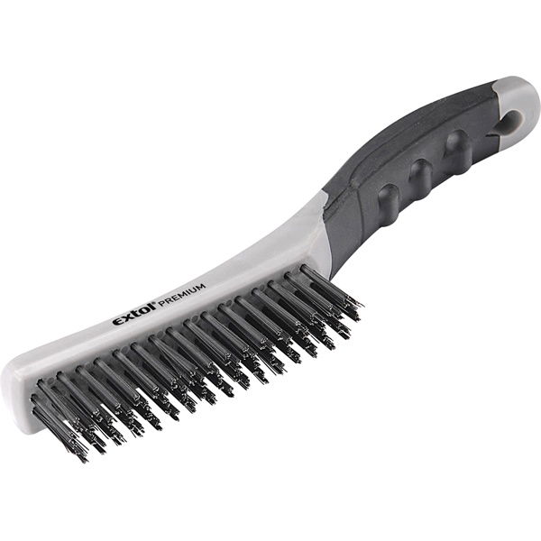 drótkefe hajlított, kétkomponensű TPR+műanyag nyél; 4 soros, 28mm szálhossz, acél, hossz: 25cm, fejméret: 27×125mm