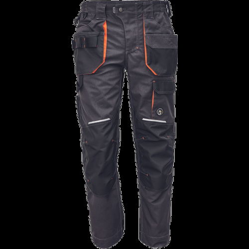 • férfi munkanadrág tágas zsebekkel • 2 szerszámtartó hurok • Oxford erősítés a térdnél és az igénybevett elemeknél • tartós hármas varrás • rugalmas derék, fényvisszavető elemek • az erősítéseken kontrasztos varratok • hosszabbítható szár