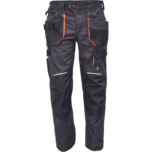 • férfi munkanadrág tágas zsebekkel • 2 szerszámtartó hurok • Oxford erősítés a térdnél és az igénybevett elemeknél • tartós hármas varrás • rugalmas derék, fényvisszavető elemek • az erősítéseken kontrasztos varratok • hosszabbítható szár