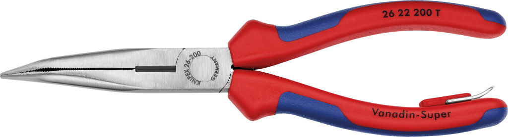 Félkerekcsőrű fogó hajlított, polír.fej, kétk.nyél 200 mm 40°-os, vágóéllel, eesés ellen biztosítható