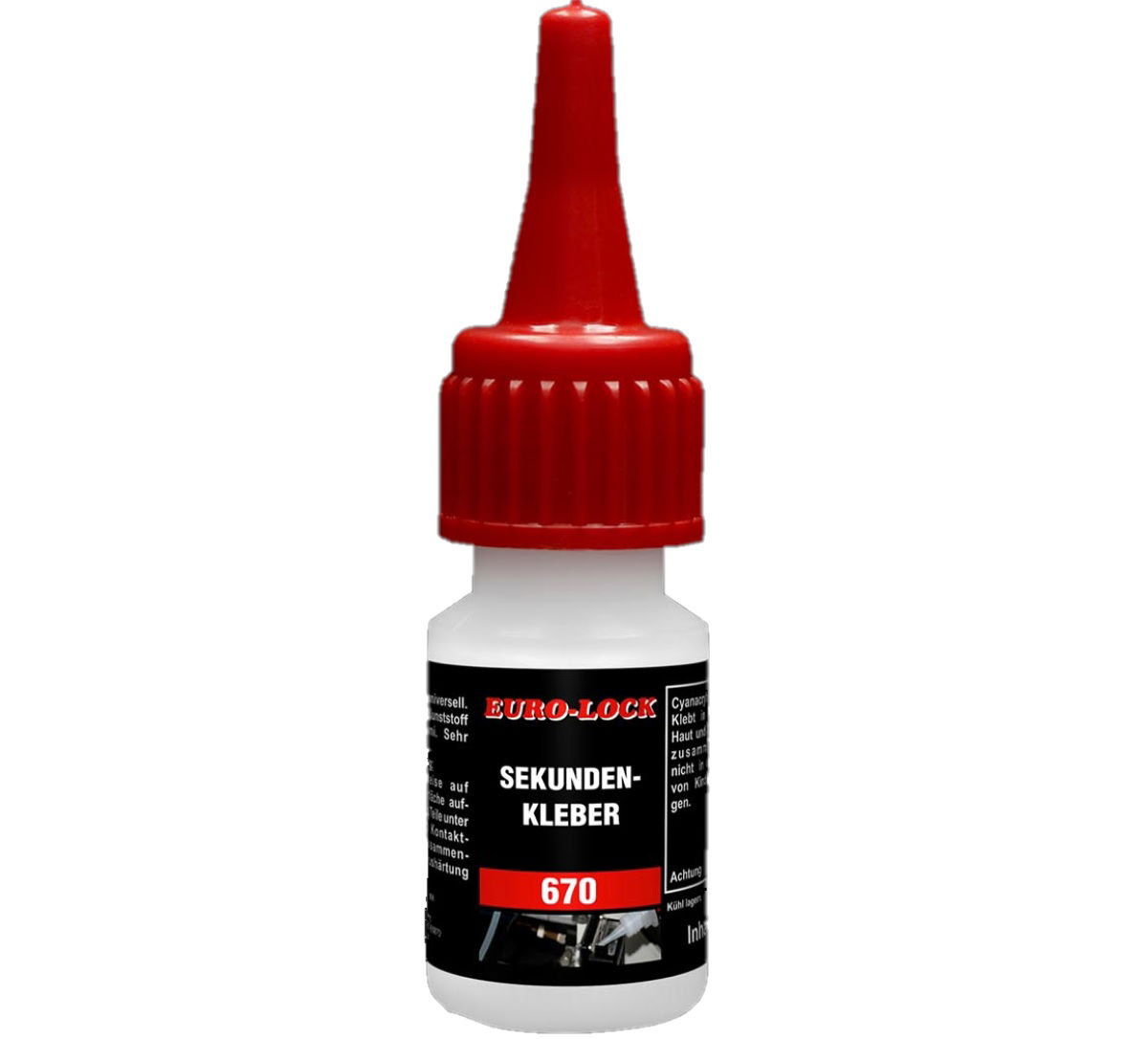 Az F 670 rugalmas, gyorsan kötő ciankrilát ragasztó. Tulajdonságok:Formája: színtelen folyadékKémiai alap: etil-cianakrilátHézagkitöltés: porózus anyagok: kb. 0,25 mm, nem porózus anyagok: kb. 0,1 mm.Szavatossági idő: 6 hónap szobahőmérsékleten, 12 hónap +2°C - +10°C-on.Fajlagos sűrűség (25°C): 1,05 g/lViszkozitás (25°C): 12-22 mPas Végső kikeményedés: 12 óra! Ragasztási sebesség:EPDM: 5 sec.Neoprén: 3-5 mp.Nitril gumi: 4 mp.Balsa: 1-2 mp.ABS: 5-10 mp.Polikarbonát: 5-10 sec.Acél: 25-40 sec. Nyírószilárdság:Acél: 15 N/mm²Alumínium: 10 N/mm²Nitril gumi: 10 N/mm²Polikarbonát: 6 N/mm²ABS: 6-10 N/mm² Szakítószilárdság:EPDM: 2,5 N/mm²Neoprén: 5 N/mm²Nitril gumi: 5 N/mm² AlkalmazásA cianakrilát ragasztókat cseppenként kell alkalmazni cseppentős flakonból vagy adagolóból. A felhordás után a ragasztandó felületeket enyhe érintkezési nyomás alatt illessze össze. A ragasztó polimerizációja néhány másodperc múlva megkezdődik, és a munkadarabok azonnal megmunkálhatók. Az optimális környezeti hőmérséklet a ragasztáshoz +20° és +25°C között van, 50-60% relatív páratartalom mellett.Nagy hidegben a kikeményedés sebessége nagyon lassú lehet. A HPDE tartályok nem biztosítanak teljes zárást. A terméket más vegyszerektől és nedvességforrásoktól távol kell tárolni.Erős fénynek való kitettség kifehérítheti a termékeket! A megfelelő ragasztás előfeltétele a tiszta felület. A felületeket meg kell tisztítani az olajtól, zsírtól és szennyeződésektől.