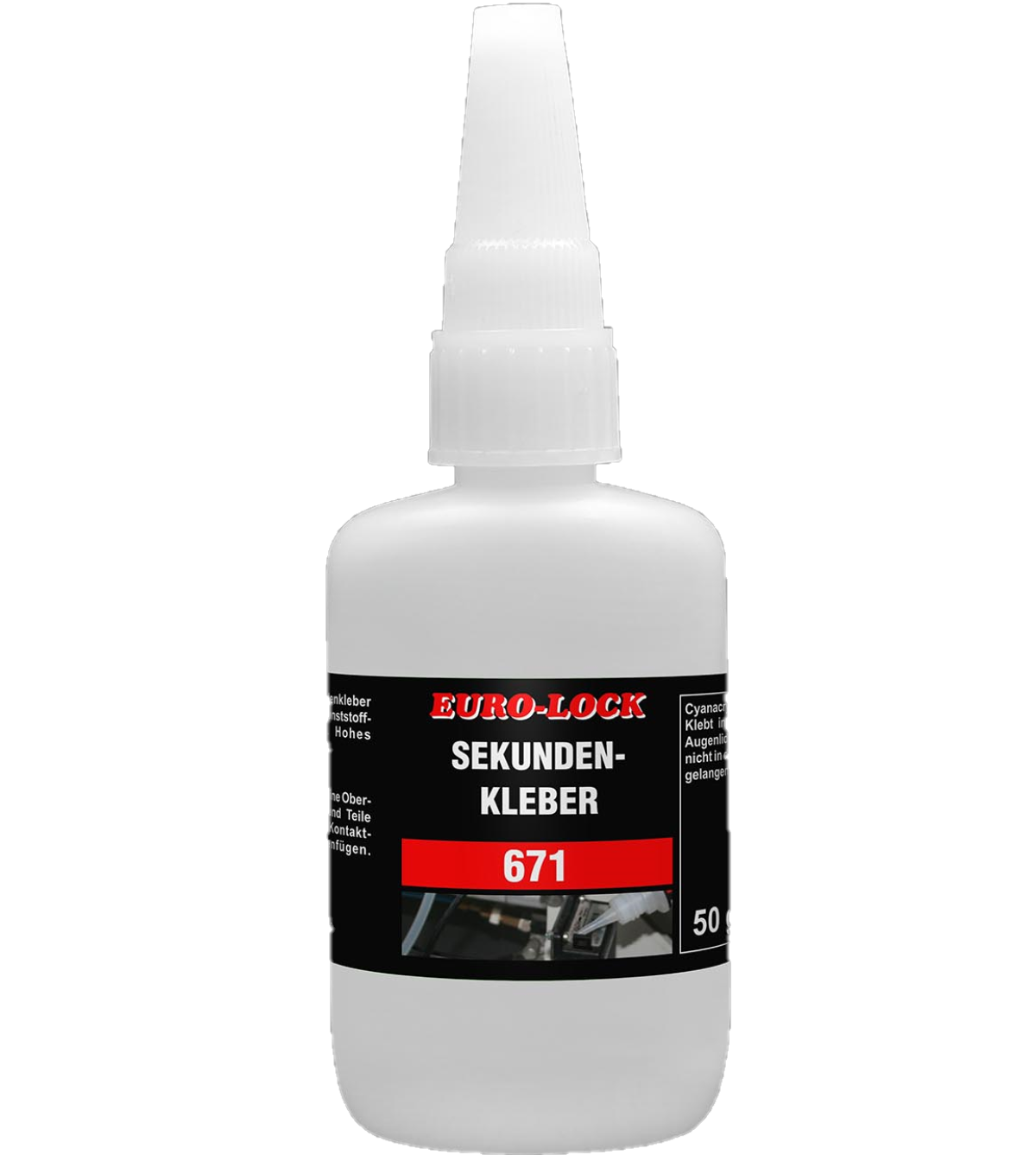 Az F 671 egy rugalmas cianakrilát ragasztó, nagy hézagkitöltő képességgel. Tulajdonságok:Formája: színtelen folyadékKémiai alapanyag: etil-cianoakrilátHézagkitöltés: porózus anyagok: kb. 0,25 mm, nem porózus anyagok: kb. 0,1 mm.Szavatossági idő: 6 hónap szobahőmérsékleten, 12 hónap +2°C - +10°C-on.Fajlagos sűrűség (25°C): 1,06 g/lViszkozitás (25°C): 1000-2000 mPas Végső kikeményedés: 12 óra! Ragasztási sebesség:EPDM: 7 sec.Neoprén: 7 sec.Nitril gumi: 7 sec.Balsafa: 10 mp.ABS: 1-2 mp.Polikarbonát: 15-25 mp.Acél: 25-40 mp. Nyírószilárdság:Acél: 15 N/mm²Alumínium: 10 N/mm²Nitrilgumi: 10 N/mm²Polikarbonát: 6 N/mm²ABS: 6-10 N/mm²Szakítószilárdság:EPDM: 5 N/mm²Neoprén: 2,5 N/mm²Nitrilgumi: 5 N/mm² AlkalmazásA cianakrilát ragasztókat cseppenként kell alkalmazni cseppentős flakonból vagy adagolóból. A felhordás után a ragasztandó felületeket enyhe érintkezési nyomás alatt illessze össze. A ragasztó polimerizációja néhány másodperc múlva megkezdődik, és a munkadarabok azonnal megmunkálhatók. Az optimális környezetihőmérséklet a ragasztáshoz +20° és +25°C között van, 50-60% relatív páratartalom mellett.Nagy hidegben a kikeményedés sebessége nagyon lassú lehet. A HPDE tartályok nem biztosítanak teljes zárást. A terméket más vegyszerektől és nedvességforrásoktól távol kell tárolni. Erős fénynek való kitettség kifehérítheti a termékeket.! A megfelelő ragasztás előfeltétele a tiszta felület.A felületeket meg kell tisztítani az olajtól, zsírtól és szennyeződésektől.