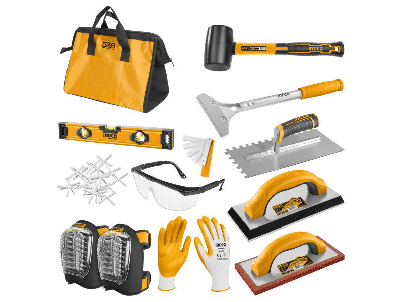 Csempézéshez szükséges szerszámkészletEgy teljes csempe fektető eszközkészlet és a hozzá tartozó munkavédelmi felszerelések10 részes burkoló szett tartalma:1 db gumi kalapács1 db festékkaparó, 5 db tartalék penge1 db 280 x 130 mm fogazott glettvas1 db 240 x 100 mm gumis fugázó1 db 230 x 100 mm finom gumis fugázó1 db 400 mm vízmérték1 db védőszemüveg1 db nitril mártott kesztyű1 db térdvédő250 db fugakereszt1 db nitril mártott kesztyű1 db 400 mm vászontáska Szállítási terjedelem: Karton dobozban
