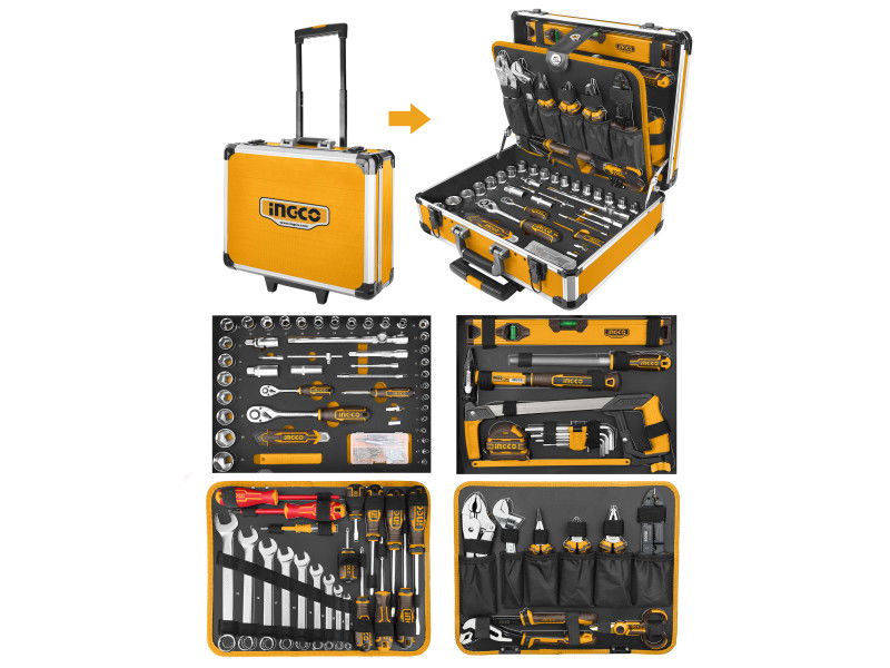 Otthoni/autó javító szerszámkészlet többféle szerszámmal a javításhoz és szétszereléshez1. Az INGCO márkájú alumínium targonca dobozt használjuk csomagolásra, könnyen hordozható2. Néhány kéziszerszámot nagy szilárdságú CRV és CR-MO fém anyagokból készítünk: Az összes fém anyagot nagyfrekvenciás hőkezeléssel készítjük, tartósak. A fogantyú a legújabb háromszínű fogantyút használja, amely kényelmes fogást és szép formát biztosít.3. A szerszámok széles választékban és specifikációkban kaphatók, és különböző helyszíneken és különböző javításokban használhatók. Többé nem kell aggódnia, hogy nem talál megfelelő specifikációjú szerszámokat.A készlet tartalma: 1 db 200 mm félköríves acélreszelő, 1 db 40 cm vízmérték, 1 db 300g gépész kalapács, 1 db 300 mm fémfűrész keret, 1 db 5 m acél mérőszalag, 9 darabos imbuszkulcs készlet (méretek: 1,5 / 2 / 2,5 / 3 / 4 / 5 / 6 / 8 / 10 mm), 1 db 17,5 cm (7") kombinált fogó, 1 db 15 cm (6") hosszú csőrű fogó, 1 db 15 cm (6") oldalcsípő fogó, 1 db 21,5 cm (8,5") kábelcsupaszító fogó, 1 db 25 cm (10") vízpumpafogó, 1 db 20 cm (8") állítható csavarkulcs, 1 db 25 cm (10") patentfogó hajlított pofával, 1 db 21,5 cm (8,5") olló, 9 db Racsnis csillag-villáskulcs (méretek: 6 / 8 / 10 / 12 / 14 / 15 / 17 / 19 / 22 mm), 4 db Csavarhúzó lapos (SL8*150 / SL6*125 / SL5*100 / SL6.5*38), 3 db Phillips csavarhúzó (PH2*150 / PH1*100 / PH2*38), 1 db 6,35 mm (1/4") mágneses szár, 2 db szigetelt csavarhúzó (SL5125 / PH2100), 1 db fáziskereső ceruza, 1 db 12,7 mm (1/2") racsnis hajtószár, 45T, 1 db 6,35 mm (1/4") racsnis hajtószár, 45T, 1 db 6,35 mm (1/4")*150 mm Behajtószár nyéllel, 1 db 6,35 mm (1/4")*150 mm flexibilis hosszabbító szár, 1 db 1/2" (F) -> 3/8" (M) háromirányú adapter, 1 db 12,7 mm (1/2") gépi csuklós csatlakozó, 1 db 6,35 mm (1/4") gépi csuklós csatlakozó, 2 db 12,7 mm (1/2") hosszabbító szár: 150 mm (5"), 250 mm (10"), 2 db 6,35 mm (1/4") hosszabbító szár: 50 mm (2"), 100 mm (4"), 18 db 12,7 mm (1/2") hatszögű dugókulcs (méretek: 10–32 mm), 13 db 6,35 mm (1/4") hatszögű dugókulcs (méretek: 4–14 mm), 2 db 12,7 mm (1/2") gyújtógyertya dugókulcs (16 mm, 21 mm), 1 db Törhető pengés kés, 10 darabos penge készlet, 1 db 6,35 mm (1/4") flexibilis hosszabbító szár, 150 mm, 1 db 6,35 mm (1/4") bittartó, 20 db 25 mm csavarhúzó bithegyek (SL3 / SL4 / SL5 / SL6 / PH0 / PH1 / PH2 / PH3 / PZ0 / PZ1 / PZ2 / PZ3 / T10 / T15 / T20 / T30 / H3 / H4 / H5 / H6), 26 db csavarok (6 db farostlemez csavar: 2,0 mm / 6 db farostlemez csavar: 2,5 mm / 7 db önmetsző csavar: 2,5 mm / 7 db önmetsző csavar: 5,0 mm), 1 db mágneses bittartó, Alumínium kofferben és kartondobozban