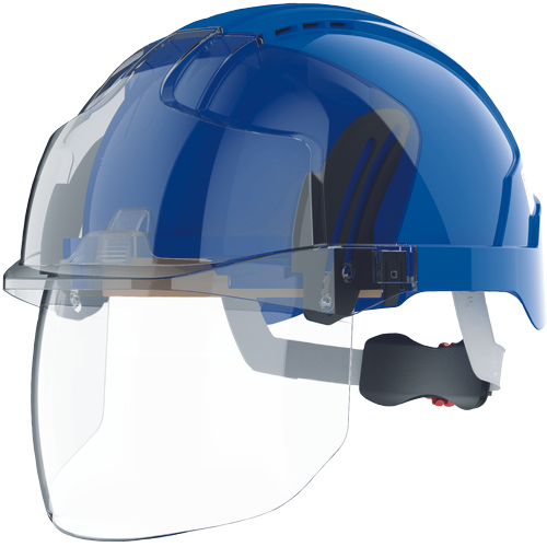 »Az EVO® VISTAshield® újgenerációs, funkciókban gazdag védősisak, beépített arcvédővel. A sisak erős és könnyű ABS héjjal készül, Evolution® 3D-Adjustment™ hevederrendszer kényelmi előnyeit nyújtja, Chamlon™ pamut izzadságpánttal. EN 397 LD MM -40°C (olvadt fémcseppek ellen, oldalirányú deformációra tesztelve, -40°C° +50°C-ig használható); EN 166 1 AT KN (1. optikai osztály, karcálló bevonat, párásodást gátló réteg, nagy energiájú szemcsék elleni védelem); EN 170 2C-1.2 (UV-sugárzás elleni védelem; magas színfelismerés, víztiszta látómező) EN 50365 1000V-ig elektromosan szigetelő