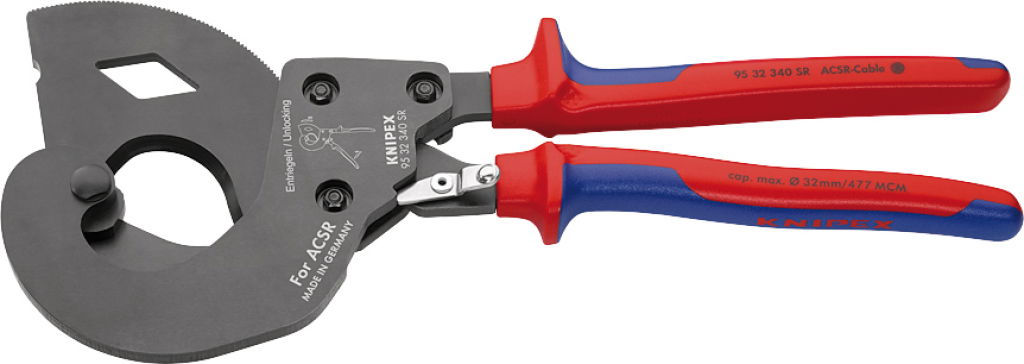 Kábelvágó olló, racsnis, kétkomponensű nyél, ACS 340 mm, d=32, ACSR kábelhez, MCM477
