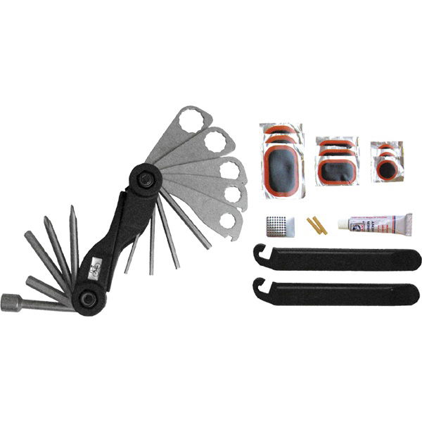 kerékpárjavító klt. 30db övrefűzhető, kulcskészlet,ragasztó+foltok, gumiszerelő