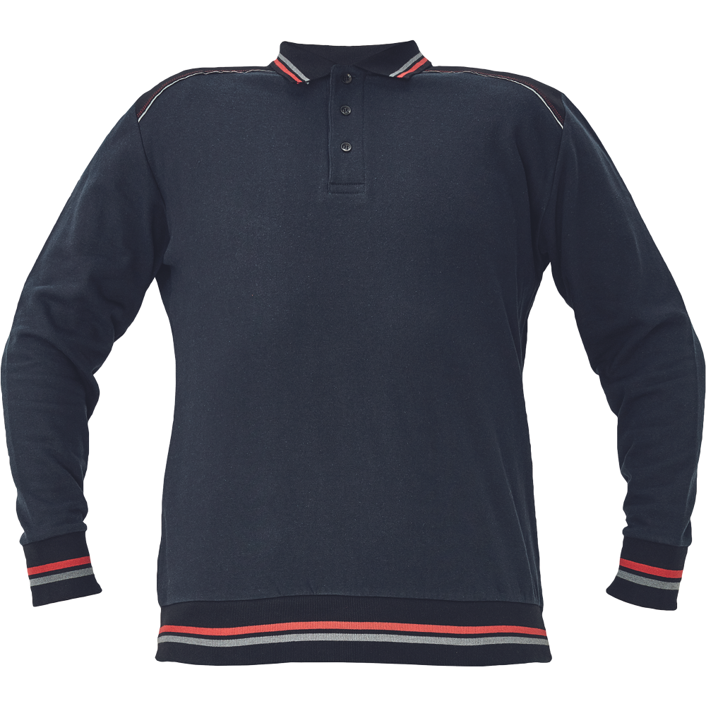 • pamut - PES kevertszálas férfi pulóver • puha francia frottír belső • kontrasztos fekete vállrész, fényvisszavető szegéllyel • 3 gombos nyakkivágás, kontrasztos csíkok a galléron