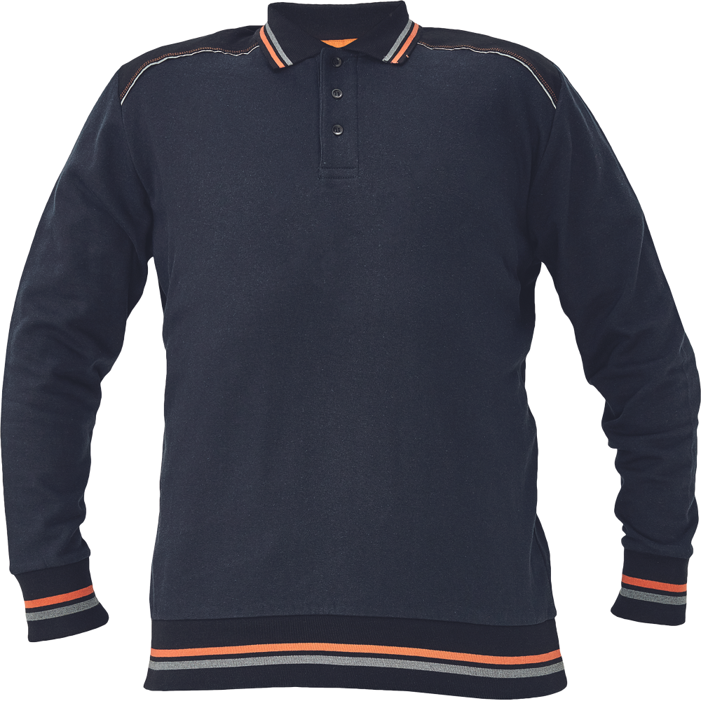 • pamut - PES kevertszálas férfi pulóver • puha francia frottír belső • kontrasztos fekete vállrész, fényvisszavető szegéllyel • 3 gombos nyakkivágás, kontrasztos csíkok a galléron