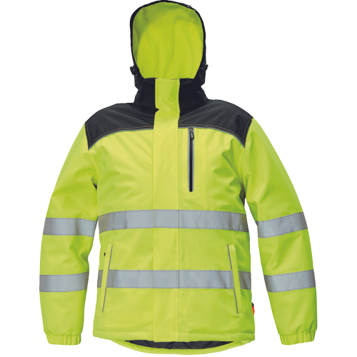 • bélelt jólláthatósági férfi télikabát levehető kapucnival • meghosszabbított hát- és vállrésszel • cipzáras, kontrasztos színű mellzsebbel • 2 oldalzsebbel • és 2 zárható belső zsebbel • A kabát alja húzózsinórral állítható • a vállrészen és a zsebeken fényvisszavető szegéllyel díszített • emblémázható