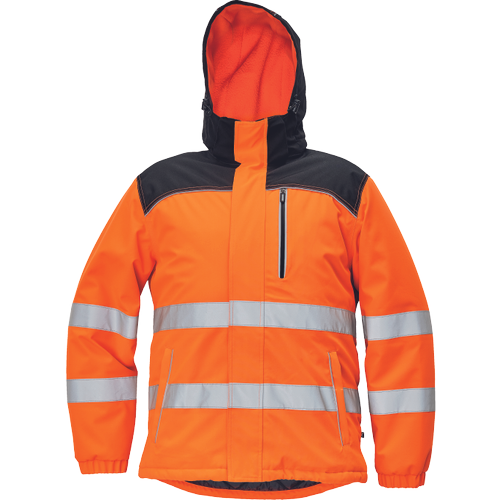 • bélelt jólláthatósági férfi télikabát levehető kapucnival • meghosszabbított hát- és vállrésszel • cipzáras, kontrasztos színű mellzsebbel • 2 oldalzsebbel • és 2 zárható belső zsebbel • A kabát alja húzózsinórral állítható • a vállrészen és a zsebeken fényvisszavető szegéllyel díszített • emblémázható