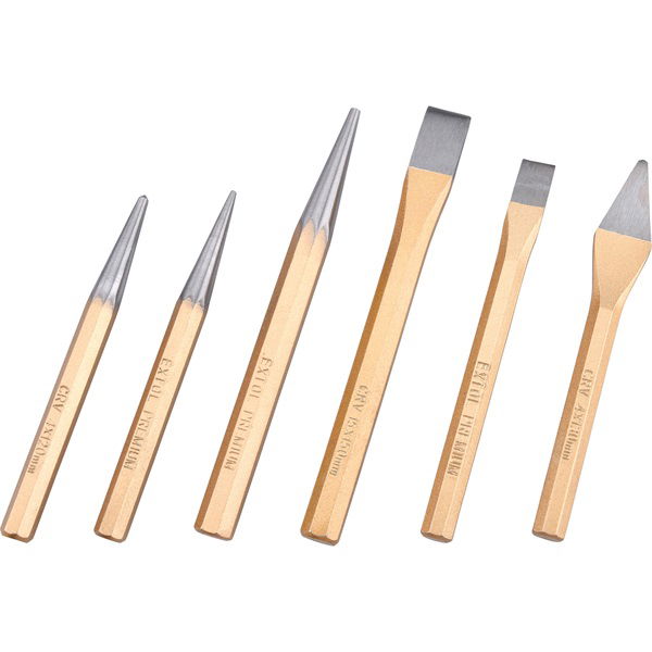 lyukasztó, pontozó és véső klt. 6db CrV. HRC 52-58 ; 1db pontozó, 2 db lyukasztó, 3 db véső, hossz.:120-150mm
