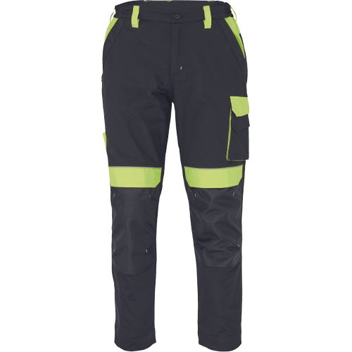 • férfi munkanadrág rugalmas derékkal • 2 első zseb, 1 dupla oldalzseb a bal száron • 2 hátsó zseb • 2 kis hátsó zseb a jobb száron • fényvisszavető szegés • Oxford 600D megerősített térdrész, térdvédőtartó • leengedhető szárak