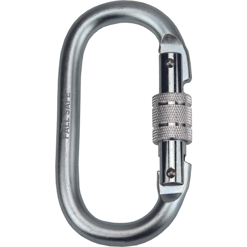 Cerva galvanized steel oval carabiner with screw safety; specifications: strength 25 kN; opening 18 mm; material steel; dimension 59 x 110 mm; meets CE EN 362-B and EN 12275-H standards