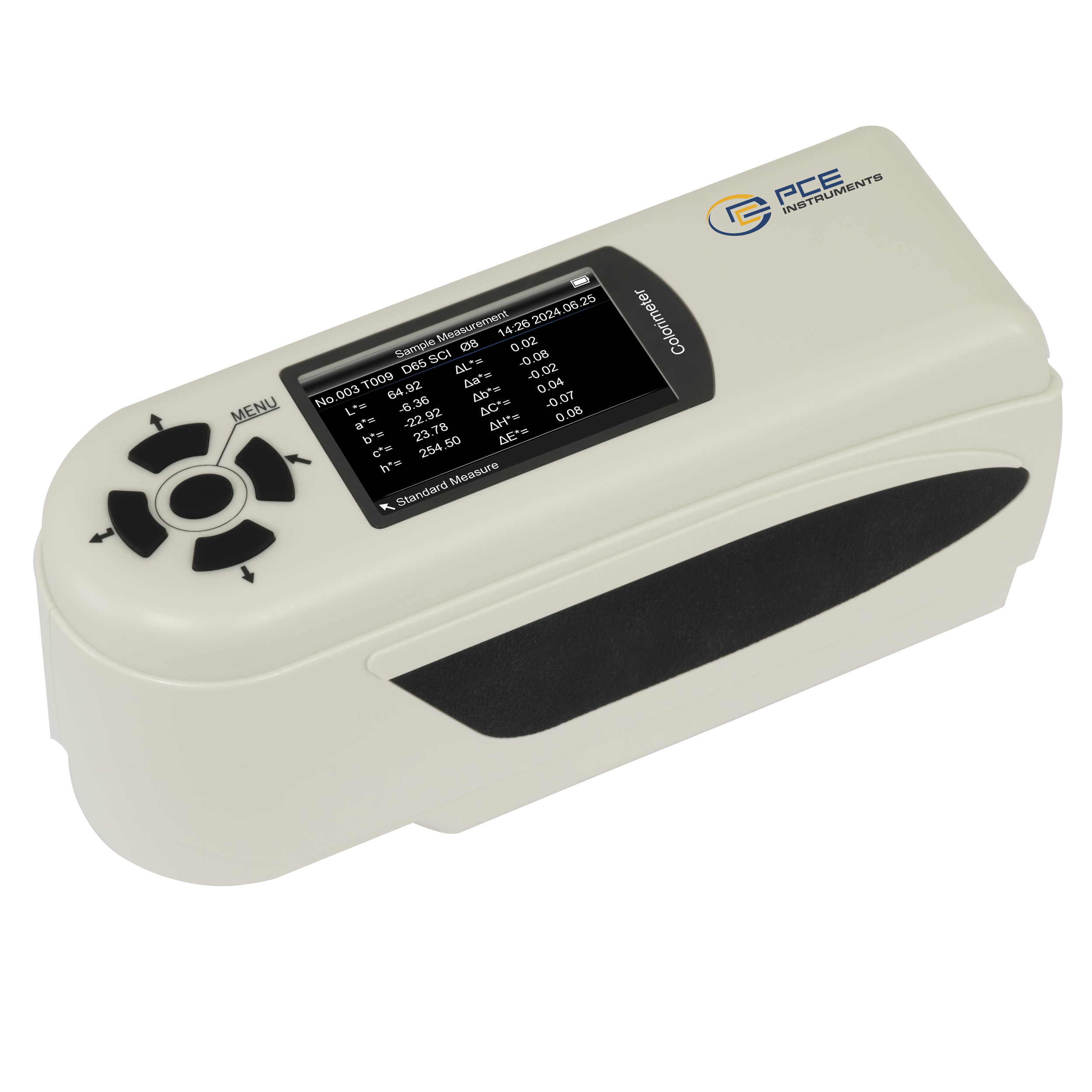 A színmérő készüléket kifejezetten a minőségbiztosításhoz fejlesztették ki, és nagyfokú pontossággal rendelkezik. A színmérő készülék lehetőséget nyújt arra, hogy a mérésekhez különböző színtereket válasszon (CIEL a*b*C*h, CIEL a*b*). A színmérő fényforrásaként egy kék LED (D65) szolgál. A mérés után az eredmény referenciaértékként használható, és további véletlenszerű minták határozhatók meg a színmérővel. A referenciaértéktől való eltérés a tényleges mérési eredmény mellett megjelenik. A meghatározott mért értékeket a koloriméter automatikusan elmenti. Legfeljebb 100 referenciaérték és legfeljebb 20 000 minta menthető el. A tárolt értékek USB-csatlakozón keresztül számítógépre is átvihetők. A speciális PC-szoftver a szállítási terjedelem részét képezi. Jellemzők: CIEL a*b*C*h, CIEL a*b*h, CIEL a*b* Fehér kalibrálás Referenciaértékek és véletlenszerű minták meghatározása Mérőnyílás Ø8 mm Nagy pontosság Hosszú akkumulátor-üzemidő Egyszerű felhasználói felület Szoftver mellékelveMűszaki adatok: Általános műszaki adatok Kijelző mérete 2,8 hüvelyk Tárolóeszköz Belső memória Memóriakapacitás 20000 érték Memóriakapacitás (kiegészítő információk) 100 szabvány, 20000 minta USB-B interfész Érzékelő Szilícium fotodióda D65 fényforrás CIEL*a*b*C*h színterek Mérőnyílás Ø 8 mm Mérési geometria 8°/d Kalibrálás Választható fehér és fekete kalibrálás között Színegyenletesség ΔE*ab,ΔL*a*b,ΔE*C*h A menü nyelve angol (US), kínai Tápegység 3,7 V / 0,5 A Dugó típusa készülék euro dugó Kapacitás 3200 mAh Üzemi feltételek 0 ... 40 °C , 0 ... 85 % r. H. Tárolási körülmények 0 ... 40 °C , 0 ... 85 % r. H. Méretek ( H x B x H ) 200 x 70 x 100 mm Tömeg 500 gSzállítási tartalom: 1 x PCE-CSM 3 koloriméter 1 x újratölthető akkumulátor 1 x kalibrációs lemez fehér 1 x PC szoftver 1 x használati utasításFigyelem! A fenti gépi fordításban hibák, elírások előfordulhatnak, megértésüket köszönjük.