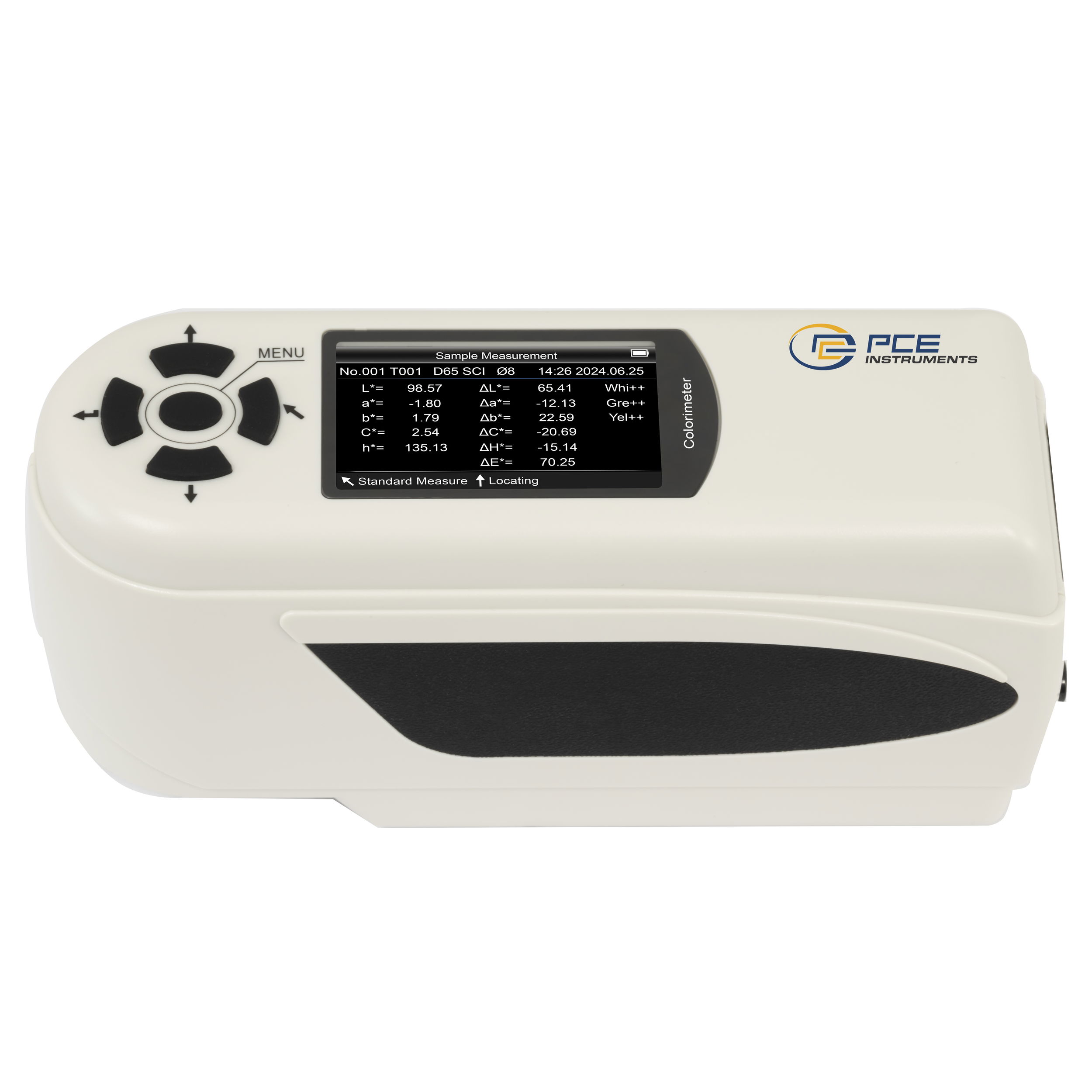 A hordozható koloriméter egy sokoldalú eszköz, amelyet kifejezetten a minőségbiztosításhoz fejlesztettek ki. A színmérő készülék különböző spektrális paraméterek mérését teszi lehetővé. A hordozható koloriméter bekapcsoláskor automatikus fehér és fekete kalibrációt végez. A koloriméter ergonomikus kialakítású és felhasználóbarát kezelőfelülettel rendelkezik. Alacsony mérési bizonytalanságával a színmérő készülék ideális professzionális használatra. Különösen a gyártó vállalatok támaszkodnak arra, hogy termékeik minősége mindig egyenletes legyen. A minőségellenőrzésben a színmérő készülék a legjobb megbízhatóságot nyújtja, amikor az optikai követelmények teljesítéséről és betartásáról van szó. A meghatározott adatok a színmérő eszközön tárolódnak, és az USB-csatlakozón keresztül egy számítógépre is átvihetők. A mellékelt szoftver segítségével az eredmények részletesebben elemezhetők és archiválhatók. Jellemzők: Újratölthető lítium-ion akkumulátor automatikus fehér/fekete kalibráció egyenletes teljesítmény fehérség különböző színek mérése Számos felületen használható Egyszerű mérési lépések Sárga árnyalatMűszaki adatok: Általános műszaki adatok A kijelző típusa TFT színes kijelző Kijelző mérete 2,8 hüvelyk Tárolóeszköz Belső memória Memóriakapacitás 20000 érték Memóriakapacitás (kiegészítő információk) 100 szabvány, 20000 minta USB-B interfész Érzékelő Szilícium fotodióda Fényforrás LED, világítótest: D65, D50, A Színterek CIEL*a*b*C*h, CIEL a* b*, CIEXYZ, CIERGB, CIEL u* v*, CIEL*C*h°, WI (fehérség), YI (sárgaság). Mérőnyílás Ø 8 mm / Ø 4 mm Mérési geometria 8°/d Kalibrálás Választható fehér és fekete kalibrálás között Színegyenletesség ΔE*ab,ΔL*ab,ΔE*C*H,ΔECIE94,ΔEHunter Menü nyelve angol (US), kínai Tápellátás 3,7 V / 0,5 A Dugótípus készülék euro dugó Kapacitás 3200 mAh Üzemi feltételek 0 ... 40 °C , 0 ... 85 % r. H. Tárolási körülmények -20 ... 50 °C , 0 ... 85 % r. H. Méretek ( H x B x H ) 205 x 70 x 100 mm Tömeg 500 gSzállítási tartalom: 1 x PCE-CSM 7 koloriméter 1 x szállítótáska 1 x újratölthető akkumulátor 1 x kalibrációs lemez fehér 1 x PC szoftver 1 x használati utasítás 2 x nyílás (4 és 8 mm átmérőjű)Figyelem! A fenti gépi fordításban hibák, elírások előfordulhatnak, megértésüket köszönjük.