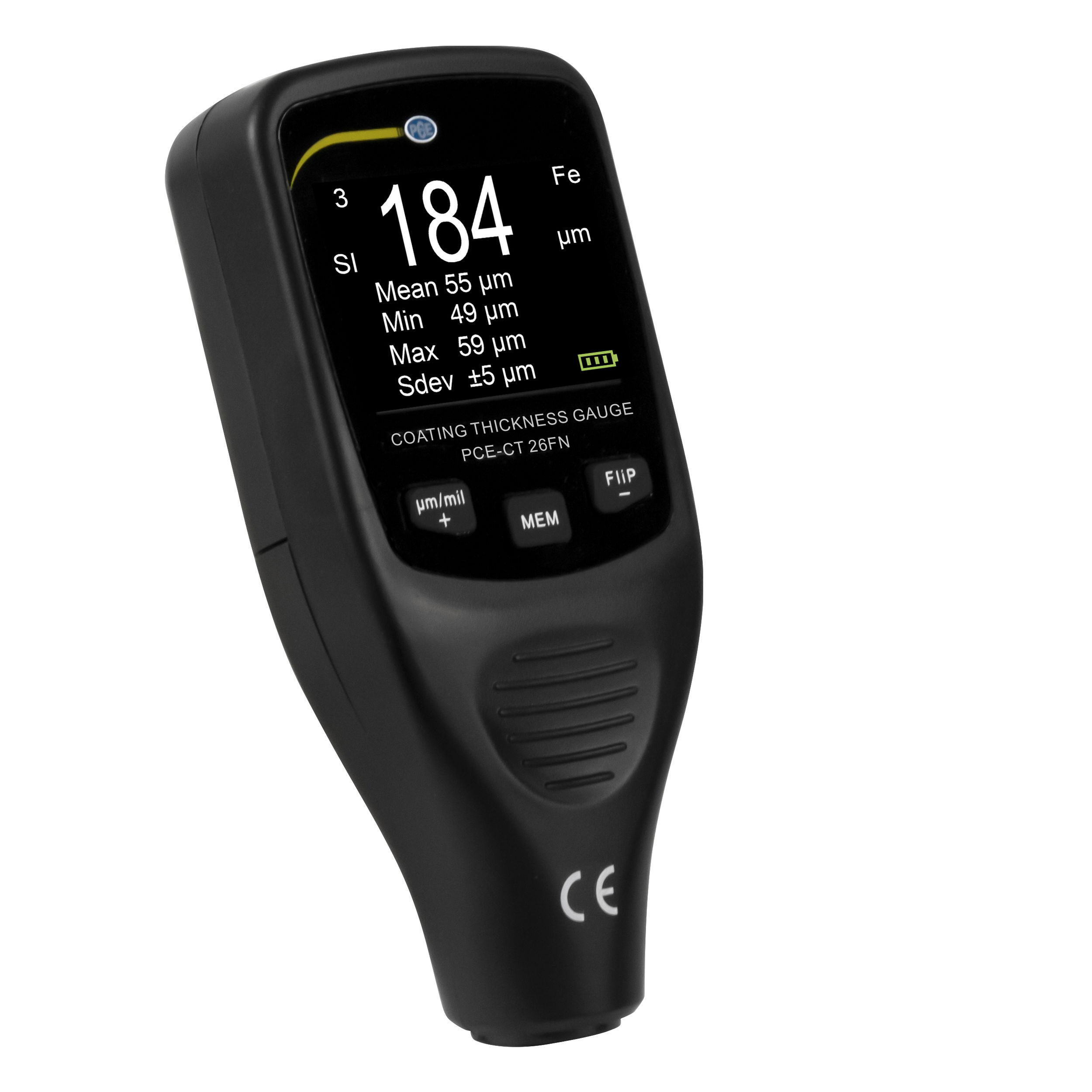 A bevonatvastagságmérő roncsolásmentesen mérheti a bevonatokat (festékek, lakkok, műanyagok stb.) acélon / vason és színesfémeken. A bevonatvastagságmérő kiválóan alkalmas például gépjárművek baleseti sérüléseinek azonnali felismerésére. A bevonatvastagságmérőt azonban az ipari szektorban is használják a bejövő és kimenő áruk ellenőrzésére, hogy mindig egyenletes termékminőséget tudjanak biztosítani. Az ergonomikusan kialakított bevonatvastagságmérő integrált mérőszondával és nagyon egyszerű kezelhetőséggel lehetővé teszi a mérési eredmények villámgyors, nagy pontosságú meghatározását. A bevonatvastagságmérő nem mágneses bevonatok, mint például festék, műanyag, króm, réz, cink, zománc stb. mérésére szolgál acélon és vason, valamint minden szigetelő bevonat, mint például festék, műanyag, zománc, papír, üveg, gumi stb. mérésére réz, alumínium, sárgaréz, rozsdamentes acél és alumínium esetében. Alkalmazás / felhasználás Egyszerűen helyezze a bevonatvastagságmérőt a felületre, és olvassa le a mért értéket. Megmérheti a festék- és lakkrétegeket, műanyagrétegeket, krómrétegeket, rézbevonatokat, cinkrétegeket, horganyzást, zománcot... acélon, rozsdamentes acélon, vason és színesfémeken (réz, alumínium, sárgaréz), valamint alumínium eloxálásán. A bevonatvastagságmérőt bármikor kalibrálhatja a szállítási terjedelemben található szabványok segítségével. Ehhez a bevonatvastagságmérőt az egyik fóliára kell helyezni. Kérjük, ügyeljen arra, hogy a mérőeszköz egyenesen / laposan üljön. Jellemzők: Azonnal mérésre kész Kopásálló érzékelő V-horony a csöveken történő méréshez egykezes működtetés ISO-kalibrálás választható szállítási táskával együttMűszaki adatok: Bevonat vastagsága Mérési tartomány 1 ... 1250 µm Felbontás 1 µm Pontosság ±(3 % +2 µm) Bevonatvastagság Mérési tartomány 0 ... 50 mil Felbontás 0,1 mil Pontosság ±(3 % +0,1 mil) Érzékelő Mérhető anyagok Fe hordozók, mint például: acél, rozsdamentes acél, vas ,NFe hordozók, mint például: réz, alumínium, sárgaréz Minimális mérési terület 5 x 5 mm Minimális rétegvastagság Fe: min. 0,5 mm,NFe: min. 0,3 mm Minimális görbületi sugár domború 3 mm Minimális görbületi sugár homorú 50 mm Általános műszaki adatok Mérési funkciók MIN, MAX, átlagérték Egység(ek) mil, µm Kijelző típusa OLED Kijelző mérete 1,8 hüvelyk Tárolóeszköz Belső memória Memóriakapacitás 99 érték Automatikus kikapcsolás 90 s Választható kalibráció: pont, több pont A menü nyelve angol (US), angol (GB) Védelmi osztály (készülék) IP20 Újratölthető elem/akkumulátor 2 x 1,5 V AAA elem, cink-szén Üzemi feltételek 0 ... 50 °C , 0 ... 90 % r. H. Tárolási körülmények 0 ... 50 °C , 0 ... 90 % r. H. Méretek ( H x B x H ) 100 x 52 x 29 mm Tömeg 63,5 gSzállítási tartalom: 1 x PCE-CT 26FN bevonatvastagságmérő 2 x AAA elem 1,5 V 1 x kalibrációs fóliakészlet (5 db) 1 x Fe szabványos blokk 1 x NFe standard blokk 1 x Szállítótáska 1 x használati útmutatóFigyelem! A fenti gépi fordításban hibák, elírások előfordulhatnak, megértésüket köszönjük.