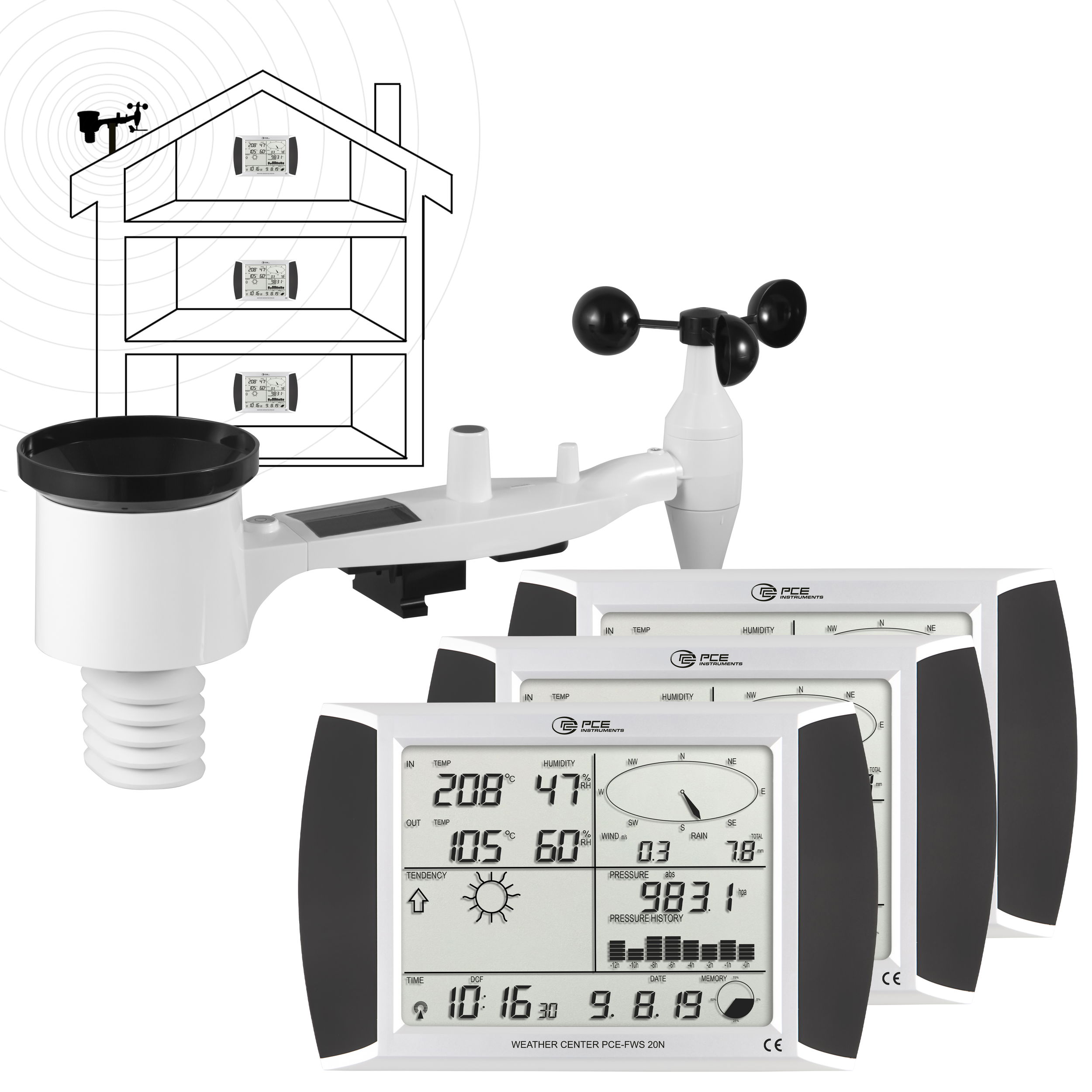 Ez az időjárás-állomás egy igazi mindenes, amely kevés kívánnivalót hagy maga után. Akár otthon, akár az irodában, az időjárás-állomás sokoldalúságával gyönyörködteti a felhasználót. Ez az időjárásállomás lehetővé teszi a szélirány, a szélerősség, a hőmérséklet, a relatív páratartalom és a csapadék pontos rögzítését. Ez csak egy kis válogatás az időjárásállomás által kínált lehetőségekből. Ezenkívül a felhasználónak lehetősége van arra, hogy az időjárásállomáson különböző riasztási funkciókat aktiváljon (szélsebesség, légnyomás stb.). Az időjárásállomáson megjelenő értékek segítségével a felhasználó többek között eldöntheti, hogy milyen ruházat a megfelelő, kell-e öntözni a kertet, és még sok minden mást. Az időjárási adatok 100 méteres távolságig rádiójelen keresztül kerülnek továbbításra a főállomásra. Az időjárás-állomás az időjáráselemzés legújabb technológiájával van felszerelve. Az adót napelem és akkumulátorok táplálják. Az újonnan kifejlesztett érintőképernyős kijelzővel az időjárási adatok egyszerűen, közvetlenül az időjárásállomásról hívhatók le, a kijelzőre történő egyszerű megérintéssel. Az USB-csatlakozó és a mellékelt USB-kábel segítségével az időjárási adatok közvetlenül az időjárás-állomásról átvihetők egy PC-re vagy laptopra. Ezek az adatok mind idő/időbélyegzővel vannak ellátva, így hosszabb idő elteltével is hozzárendelhetők. Az időjárási adatok itt korlátlan ideig tárolhatók. A mellékelt elemző szoftver ezután lehetővé teszi a felhasználó számára, hogy az időjárási eseményeket hosszabb időn keresztül grafikonok és diagramok segítségével megfigyelje és összehasonlítsa. A szállítási terjedelem mindent tartalmaz, amire a felhasználónak szüksége van az időjárás-állomás beállításához és használatához. Jellemzők: Szoftver a tárolt adatok elemzéséhez Háttérvilágítású 7 hüvelykes érintőképernyő Időjárás-előrejelző funkció Automatikus időbeállítás a DCF-nek köszönhetően Beállítható riasztások a mért értékek túllépésekor Szélirány és szélsebesség Hőmérséklet és páratartalom kijelzés Napelem a kültéri egységen az energiaellátáshozMűszaki adatok: Relatív páratartalom Mérési tartomány 1 ... 99 % Felbontás 1 % Levegőnyomás Mérési tartomány 300 ... 1100 hPa Felbontás 0,1 hPa Pontosság ±3 hPa Hőmérséklet Mérési tartomány 0 ... 50 °C Felbontás 0,1 °C Általános műszaki adatok Kijelző típusa LC érintőkijelző Kijelző mérete 7 hüvelyk Tárolóeszköz Belső memória Memóriakapacitás 4080 adatrekord Memóriakapacitás (további információk) Gyűrűs memória Tárolási időköz 5 s Tárolási intervallum legfeljebb 240 percig. USB interfész Működési idő 2 év(ek) Működési idő kiegészítő információk kijelzője: min. 12 hónap, kültéri egység: min. 24 hónap Menü nyelve angol (US) Védelmi osztály (készülék) IP X3, IP44 Újratölthető elem/akkumulátor 11 x 1,5 V AA elem, lúgos-mangános Kapacitás 3000 mAh Méretek ( H x B x K ) 230 x 230 x 150 mm Tömeg 551 gSzállítási tartalom: 1 x PCE-FWS 20N-2 időjárás-állomás 3 érintőképernyős kijelzővel 1 x adó 1 x hőmérséklet-érzékelő 1 x páratartalom-érzékelő 1 x napelemes modul 5 x elem 1 x esőérzékelő 1 x szélsebesség-érzékelő 1 x szélirány érzékelő 1 x USB csatlakozókábel (kb. 1 m) 1 x időjáráselemző szoftver 1 x használati utasításFigyelem! A fenti gépi fordításban hibák, elírások előfordulhatnak, megértésüket köszönjük.