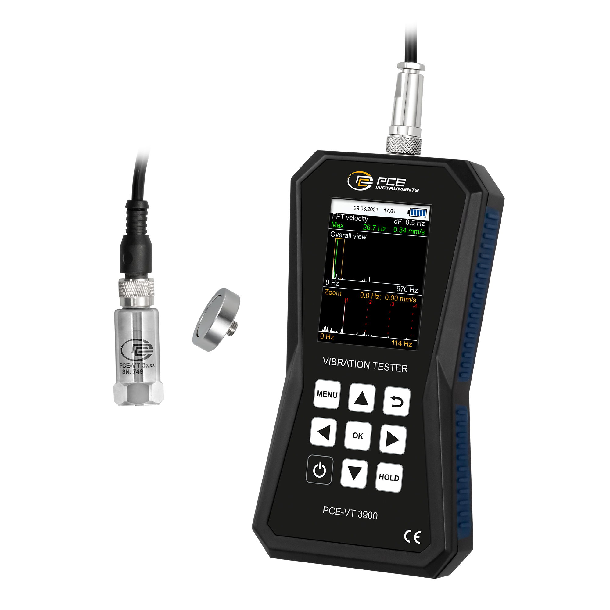 A rezgésmérő készülék ideális mérőeszköz a rezgő alkatrészek, gépek és rendszerek gyors és pontos vizsgálatához. Ez a rezgésmérő készülék a külső rezgésérzékelőt használja a rezgési elmozdulás (mérési tartomány 0,000 ... 3,9 mm), a rezgési sebesség (mérési tartomány 0,00 ... 399,9 mm/s) és a rezgési gyorsulás (mérési tartomány 0,0 ... 399,9 m/s²) meghatározására. A rezgésmérőhöz különböző mérési paraméterek állnak rendelkezésre, mint például az RMS, csúcs, csúcs-csúcs és a csúcsérték faktor. A rezgésmérő olyan üzemmóddal van felszerelve, amely lehetővé teszi a mérés automatikus kiértékelését az ISO 10816-3 szabvány határértékei szerint. A rezgésmérő elemzi a mért értékeket, és a kijelzőn megjeleníti a megfelelő megfelelt/nem felelt meg értékelést. A rezgésmérő beépített akkumulátora 2500 mAh kapacitású, és a beépített mikro-USB-csatlakozón keresztül közvetlenül feltölthető. A rezgéselemző a normál mérési mód mellett FFT móddal is rendelkezik. FFT módban a mért rezgési sebesség vagy rezgési gyorsulás frekvencia spektruma kiszámításra és megjelenítésre kerül. A grafikus kijelzőn a kiszámított FFT-vonalak a teljes frekvenciasávra vonatkozóan össznézetben, az egyes vonalak megjelenítéséhez pedig párhuzamosan zoomnézetben láthatók. További funkció az útvonalmérés. Az útvonalmérés kifejezetten az azonos mérési pontokon történő ismétlődő mérésekhez készült. Ez lehetővé teszi a különböző mérési pontok szervezett mérését. A rezgésmérő készüléket ezért a kiterjedt mérési funkcióknak köszönhetően a gépek karbantartási és javítási munkáihoz használják. A rezgésmérő készülék belső memóriája a különböző mérési funkciók megjelenített mérési adatainak mentésére használható. A mérés után a rezgéselemző készülékben tárolt mérési adatok a beépített micro-USB interfészen keresztül átvihetők egy számítógépre. A rezgésmérő készülék szoftverével ezután a mért értékek grafikusan és táblázatos formában is elemezhetők. A mérési adatok a szoftveren keresztül CSV-fájlként exportálhatók további feldolgozás céljából. Annak érdekében, hogy a rezgésmérő készülék mindig naprakész legyen, a szoftver a mérési adatok elemzése mellett automatikus firmware-frissítésre is használható. Jellemzők: mobil rezgésméréshez Mérési tartomány 399,9 m/s²-ig terjedő mérési tartomány FFT-elemzés útvonal-mérés Kézi mérési érték memória automatikus ISO 10816-3 kiértékelés belső memória 2,48" LC kijelző újratölthető akkumulátor Micro-USB interfészMűszaki adatok: Gyorsítás Mérési tartomány 0 ... 399,9 ft/s² Felbontás 0,1 ft/s² Pontosság ±2 % Frekvenciatartomány 10 Hz ... 10 kHz,1 kHz ... 10 kHz Optikai sebesség Mérési tartomány 600 ... 50000 fordulat/perc Optikai sebesség Mérési tartomány 0 ... 399,9 km/h Felbontás 0,1 mm/s Pontosság ±2 % Frekvenciatartomány 10 Hz ... 1 kHz Elmozdulás Mérési tartomány 0 ... 3,9 hüvelyk Felbontás 1 inch Pontosság ±2 % Frekvenciatartomány 10 Hz ... 200 Hz Érzékelő Megnevezés PCE-VT 3xxx ÉRZÉKELŐ További leírás Rezonanciafrekvencia: 24 kHz,Keresztérzékenység: Δ 5%,Rombolási határ: 5000 g (csúcs),Ház anyaga: rozsdamentes acél,Szerelési menet: ¼ - 28 Méret Ø 17 x 46 mm Általános műszaki adatok Mérőcsatornák száma 1 Mérési funkciók RMS, csúcsérték, csúcsérték-csúcsérték FFT FFT gyorsulás: 10 Hz ... 8 kHz, FFT sebesség: 10 Hz ... 1 kHz,Pontosság 160 Hz-en: ±2 %,FFT sorok száma: 2048,Útvonalmérés: 100 útvonal, mindegyik 100 géppel, mindegyik 100 mérési ponttal, mindegyik 1000 mért értékkel. Frekvencia 10 ... 10000 Hz Kijelző típusa LCD Kijelző mérete 2,8 hüvelyk Tárolóeszköz Belső memória Memóriakapacitás 2160000 érték Tárolási időköz 1 s-tól Tárolási intervallum 12 percig Interfész nulla A menü nyelve angol (US), német, francia, spanyol, olasz, holland, portugál, török, lengyel, orosz, kínai, japán, orosz, német, német, francia, olasz, portugál, török, lengyel, orosz, kínai, japán Védelmi osztály (készülék) IP52 Tápellátás Akkumulátor: 3,7 V,USB: 5 VDC, 500 mA Kapacitás 2500 mAh Működési feltételek -20 ... 65 °C , 10 ... 95 % r. H. Tárolási körülmények -20 ... 65 °C , 10 ... 95 % r. H. Méretek ( H x B x H ) 165 x 85 x 32 mm Egyéb méretek Rezgésérzékelő Ø 17 x 46 mm Tömeg 239 g Egyéb súlyok Rezgésérzékelő 52 gSzállítási tartalom: 1 x PCE-VT 3900 rezgésmérő készülék 1 x érzékelő 1 x spirális kábel 1 x mágneses adapter 1 x Micro-USB kábel 1 x USB stick szoftverrel és kézikönyvvel 1 x Gyorsindítási útmutató 1 x szerviztáskaFigyelem! A fenti gépi fordításban hibák, elírások előfordulhatnak, megértésüket köszönjük.