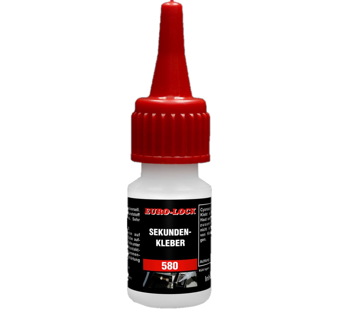 Az M 580 egy cianakrilát ragasztó fémek gyors ragasztására. Tulajdonságok:Formája: színtelen folyadékKémiai alap: metil-cianakrilátRagasztási hézag: porózus anyagok: 0,25 mm-ig, nem porózus anyagok: 0,1 mm-ig.Szavatossági idő: 6 hónap szobahőmérsékleten, 12 hónap +2° és +10°C között.Fajlagos sűrűség (25°C): 1,05 g/lViszkozitás (25°C): 80-120 mPas Végső kikeményedés: 12 óra. Ragasztási sebesség:EPDM: 7 sec.Neoprén: 7 mp.Nitril gumi: 7 mp.Balsa: 10 sec.ABS: 15-10 sec.Polikarbonát: 60 sec.Acél: 25-40 sec. Nyírószilárdság:acél: 15 N/mm²Alumínium: 10 N/mm²Nitrilgumi: 10 N/mm²Polikarbonát: 6 N/mm²ABS: 6-10 N/mm² Szakítószilárdság:EPDM: 2,5 N/mm²Neoprén: 5 N/mm²Nitrilgumi: 5 N/mm² AlkalmazásA cianakrilát ragasztókat cseppenként kell alkalmazni cseppentős flakonból vagy adagolóból. A felhordás után a ragasztandó felületeket enyhe érintkezési nyomás alatt illessze össze. A ragasztó polimerizációja néhány másodperc múlva megkezdődik, és a munkadarabok azonnal megmunkálhatók. Az optimális környezeti hőmérséklet aragasztáshoz +20° és +25°C között van, 50-60% relatív páratartalom mellett.Nagy hidegben a kikeményedés sebessége nagyon lassú lehet. A HPDE tartályok nem biztosítanak teljes zárást. A terméket más vegyszerektől és nedvességforrásoktól távol kell tárolni.Erős fénynek való kitettség kifehérítheti a termékeket! A megfelelő ragasztás előfeltétele a tiszta felület, ezrét afelületeket meg kell tisztítani az olajtól, zsírtól és szennyeződésektől.