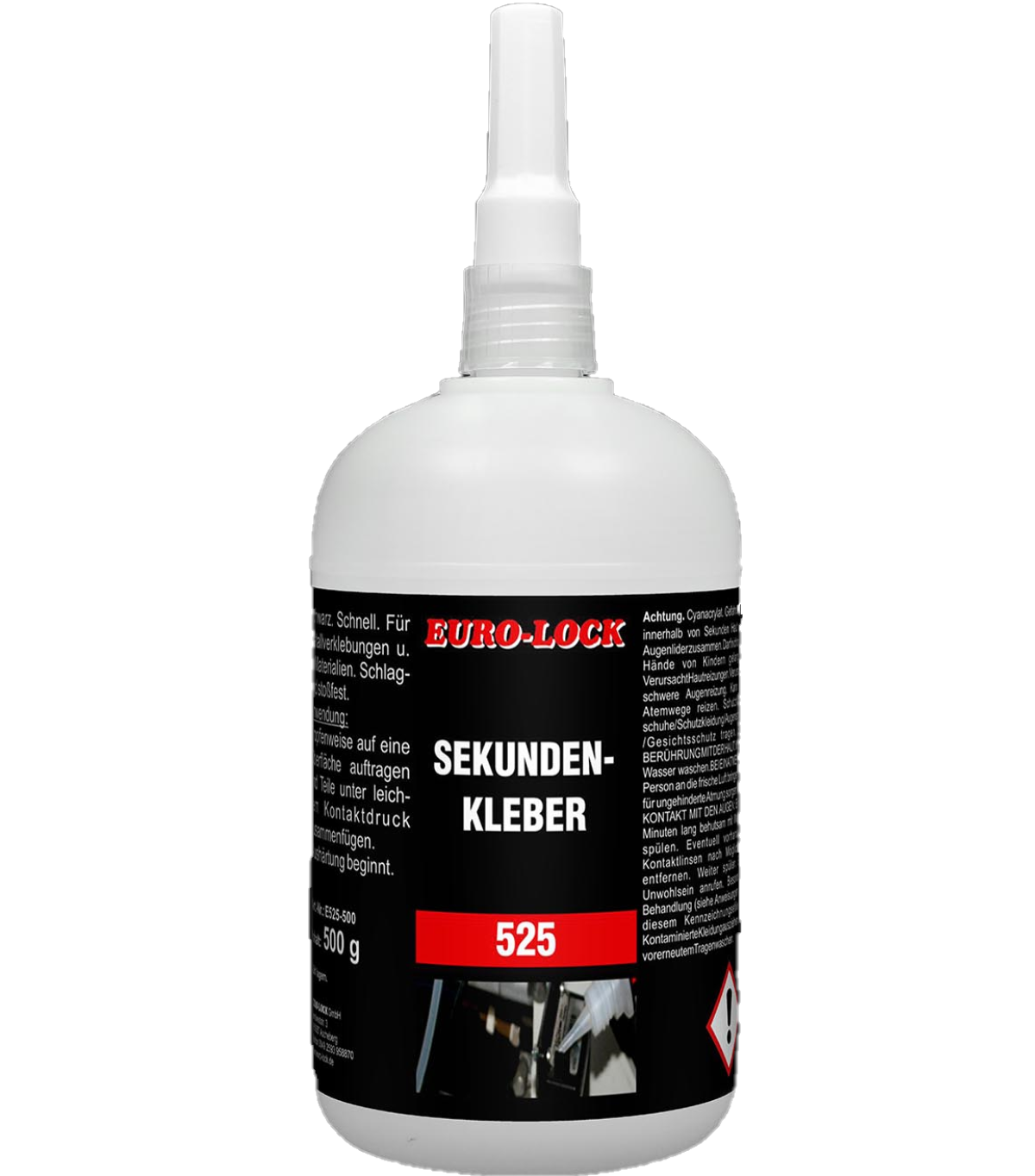 Az E 525 közepes viszkozitású, gumírozott cianakrillát ragasztó a legtöbb ipari alkalmazáshoz.Különösen alkalmas gumi, fém ragasztására,neoprén, acél, polikarbonátok és műanyagok ragasztásához.Speciális alkalmazások: Gumi O-gyűrűk,játékok, modellek, ékszerek és még sok más.Az E 525 egykomponensű, könnyen kezelhető és szobahőmérsékleten gyorsan köt.Ellenáll a nedvességnek és az oldószereknek.Tulajdonságok:Szín: FeketeTípus: EtilLobbanáspont: 81° CRagasztási hézag: porózus anyagok: kb. 0,25 mm, nem porózus: kb. 0,1 mm.Szavatossági idő: 6 hónap szobahőmérsékleten, 12 hónap +2°C - +10°C-on.Fajsúly: 1,05 g/lViszkozitás (25°C): 3000-4000 mPasKeményedési idő:Végső kikeményedés: 24 óra !Balsa: 10-30 sec.Nitril: 15 mp.Neoprén: 15 mp.EPDM: 20 mp.Acél: 50-70 mp.Polikarbonát: 20-50 sec.Nyírószilárdság:Acél: 20 N/mm²Alumínium: 12 N/mm²Nitrilgumi: 5 N/mm²Szakítószilárdság:Acél: 18 N/mm²Nitrilgumi: 5 N/mm²Neoprén gumi: 5 N/mm²Alkalmazás:A cianakrillát ragasztókat cseppenként kell alkalmazni cseppentős flakonból vagy adagolóból. A felhordás után a ragasztandó felületet enyhe érintkezési nyomás alatt hozza össze.A ragasztó polimerizációja néhány másodperc múlva megkezdődik, és a munkadarabok azonnal megmunkálhatók.Az optimális környezeti hőmérséklet a ragasztáshoz +20° és +25°ー C között, 50-60% relatív páratartalom mellett.Nagyon magas hőmérsékleten hidegben a kikeményedés sebessége nagyon lassú lehet.A HPDE tartályok nem képeznek teljes gátat. Tárolja a terméket más vegyszerektől és nedvességforrásoktól távol. Erős fénynek való kitettség kifehérítheti a termékeket!A ragasztási felületek előkészítése:A felületeket meg kell tisztítani az olajtól, zsírtól és szennyeződésektől, javasoljuk aLos 2000ipari tisztító használatát!