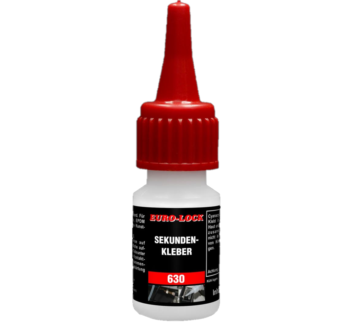 Az E 630 egy cianakrilát ragasztó porózus és nedvszívó anyagokhoz, például fához, parafához, bőrhöz és műanyaghoz. Tulajdonságok:Formája: színtelen folyadékKémiai alapanyag: etil-cianoakrilátRagasztási hézag: porózus anyagok: kb. 0,25 mm, nem porózus: kb. 0,1 mm.Szavatossági idő: 6 hónap szobahőmérsékleten, 12 hónap +2°C - +10°C-on.Fajlagos sűrűség (25°C): 1,05 g/lViszkozitás (25°C): 12-22 mPasVégső kikeményedés: 12 óra!Ragasztási sebesség:EPDM: 5 sec.Neoprén: 3,5 mp.Nitril gumi: 4 mp.Balsa: 1,2 mp.ABS: 5-10 sec.Polikarbonát: 5-10 sec.Acél: 25-40 sec. Nyírószilárdság:Acél: 15 N/mm²Alumínium: 10 N/mm²Nitril gumi: 10 N/mm²Polikarbonát: 6 N/mm²ABS: 6-10 N/mm² Szakítószilárdság:EPDM: 2,5 N/mm² Nitril gumi: 10 N/mm²Nitrilgumi: 5 N/mm²Neoprén gumi: 5 N/mm² AlkalmazásA cianakrilát ragasztókat cseppenként kell alkalmazni cseppentős flakonból vagy adagolóból. A felhordás után a ragasztandó felületet enyhe érintkezési nyomás alatt illessze össze.A ragasztó polimerizációja néhány másodperc múlva megkezdődik, és a munkadarabok azonnal megmunkálhatók.Az optimális környezeti hőmérsékleta ragasztáshoz +20° és +25°C között van, 50-60% relatív páratartalom mellett.Nagy hidegben a kikeményedés sebessége nagyon lassú lehet. A HPDE tartályok nem biztosítanak teljes zárást. A terméket más vegyszerektől és nedvességforrásoktól távol kell tárolni.Erős fénynek való kitettség kifehérítheti a termékeket! A felületeket meg kell tisztítani az olajtól, zsírtól és szennyeződésektől, javasoljuk aLos 2000ipari tisztító használatát!