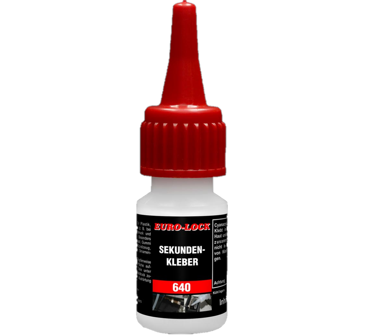 Az E 640 egy cianakrilát ragasztó, leginkább műanyaghoz, fémhez, gumihoz és játékokhoz,ékszerek és dísztárgyakhoz. Tulajdonságok:Kialakulási forma: színtelen folyadékKémiai alap: etil-cianoakrilátHézagkitöltés: porózus anyagok: kb. 0,25 mm, nem porózus anyagok: kb. 0,1 mm.Szavatossági idő: 6 hónap szobahőmérsékleten, 12 hónap +2°C - +10°C-on.Fajlagos sűrűség (25°C): 1,05 g/lViszkozitás (25°C): 80-120 mPasVégső kikeményedés: 12 óra. Ragasztási sebesség:EPDM: 7 sec.Neoprén: 7 mp.Nitril gumi: 7 mp.Balsa: 10 sec.ABS: 15-20 sec.Polikarbonát: 60 sec.Acél: 25-40 sec. Nyírószilárdság:Acél: 15 N/mmAlumínium: 10 N/mmNitril gumi: 10 N/mmPolikarbonát: 6 N/mmABS: 6-10 N/mm Szakítószilárdság:EPDM: 2,5 N/mm².Neoprén: 5 N/mm²Nitrilgumi: 5 N/mm² AlkalmazásA cianakrillát ragasztókat cseppenként kell alkalmazni cseppentős flakonból vagy adagolóból. A felhordás után a ragasztandó felületet enyhe érintkezési nyomás alatt illessze össze. A ragasztó polimerizációja néhány másodperc múlva megkezdődik, és a munkadarabok azonnal megmunkálhatók. Az optimális környezeti hőmérsékleta ragasztáshoz +20° és +25°C között van, 50-60% relatív páratartalom mellett.Nagy hidegben a kikeményedés sebessége nagyon lassú lehet. A HPDE tartályok nem biztosítanak teljes zárást. A terméket más vegyszerektől és nedvességforrásoktól távol kell tárolni.Erős fénynek való kitettség kifehérítheti a termékeket! A megfelelő ragasztás előfeltétele a tiszta felület.A felületeket meg kell tisztítani az olajtól, zsírtól és szennyeződésektől.