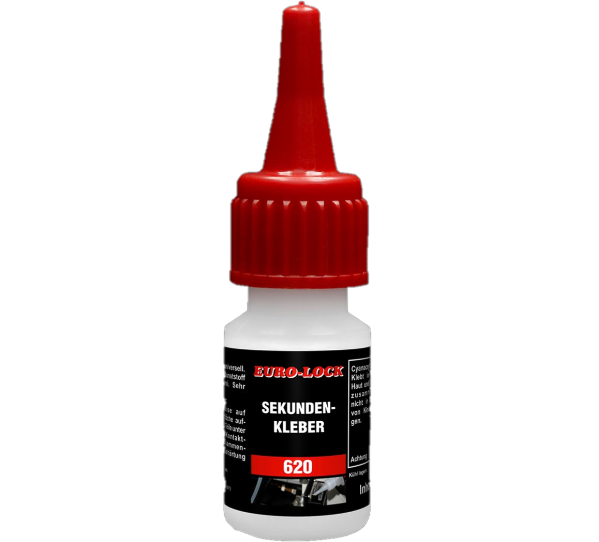 Az E 620 egy cianakrilát ragasztó porózus és nedvszívó anyagokhoz, például fához, parafához, bőrhöz és műanyaghoz. Tulajdonságok:Formája: színtelen folyadékKémiai alapanyag: etil-cianoakrilátHézagkitöltés: 0,25 mm-igSzavatossági idő: 6 hónap szobahőmérsékleten, 12 hónap +2°C - +10°C-on.Fajlagos sűrűség (25°C): 1,05 g/lViszkozitás (25°C): 80-120 mPasVégső kikeményedés: 12 óra! Ragasztási sebesség:EPDM: 5 sec.Neoprén: 5 mp.Nitril gumi: 5 mp.Balsa: 3 sec.ABS: 15-20 sec.Polikarbonát: 15-40 sec.Acél: 15-30 sec. Nyírószilárdság:Acél: 15 N/mm²Alumínium: 10 N/mm²Nitrilgumi: 10 N/mm²Polikarbonát: 6 N/mm²ABS: 6-10 N/mm² Szakítószilárdság:EPDM: 2,5 N/mm² Nitril gumi: 10 N/mm²Nitrilgumi: 5 N/mm²Neoprén gumi: 5 N/mm² AlkalmazásA cianakrilát ragasztókat cseppenként kell alkalmazni cseppentős flakonból vagy adagolóból. A felhordás után a ragasztandó felületet enyhe érintkezési nyomás alatt illessze össze. A ragasztó polimerizációja néhány másodperc múlva megkezdődik, és a munkadarabok azonnal megmunkálhatók. Az optimális környezeti hőmérséklet aragasztáshoz +20° és +25°C között van, 50-60% relatív páratartalom mellett.Nagy hidegben a kikeményedés sebessége nagyon lassú lehet. A HPDE tartályok nem biztosítanak teljes zárást. A terméket más vegyszerektől és nedvességforrásoktól távol kell tárolni.Erős fénynek való kitettség kifehérítheti a termékeket! A megfelelő ragasztás előfeltétele a tiszta felület.A felületeket meg kell tisztítani az olajtól, zsírtól és szennyeződésektől.