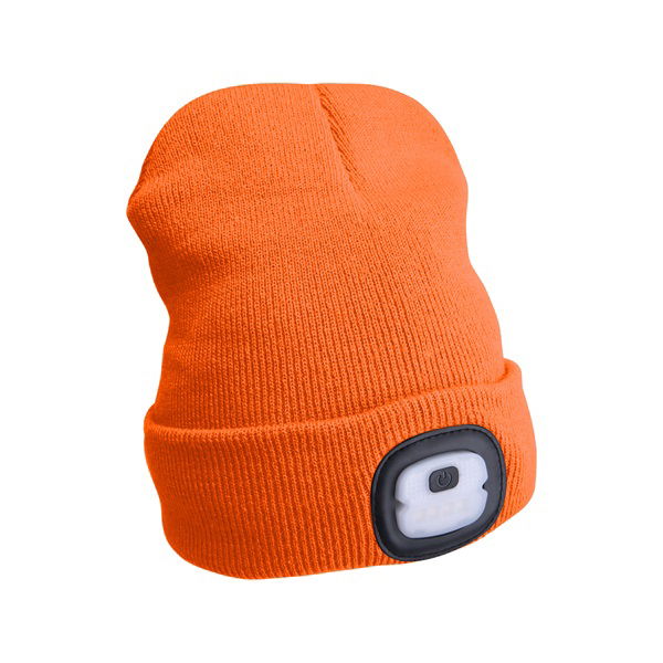 sapka, neon-narancs, kötött, kivehető LED homloklámpával, 4×25 Lumen; USB tölthető Li-ion akku, 3funkció (100%-75%-50%)