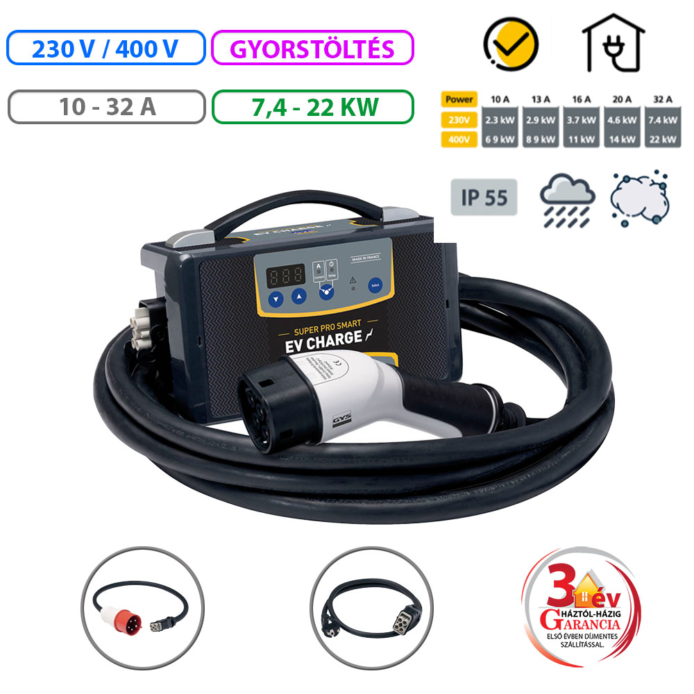 A SUPER PRO SMART - EV CHARGE lehetővé teszi a felhasználó számára, hogy a lehető leggyorsabban töltse fel járművét a helyszínen rendelkezésre álló aljzatnak megfelelően (230 V-os vagy 400 V-os). Két, könnyen cserélhető hálózati kábellel szállítva gyors töltést tesz lehetővé bárhol egy 32 A-es aljzaton. A különböző tápegységek közötti váltás lehetősége azt jelenti, hogy az egység minimális helyet foglal el a járműben, amely a hordtáskának köszönhetően a lehető legkompaktabb marad.