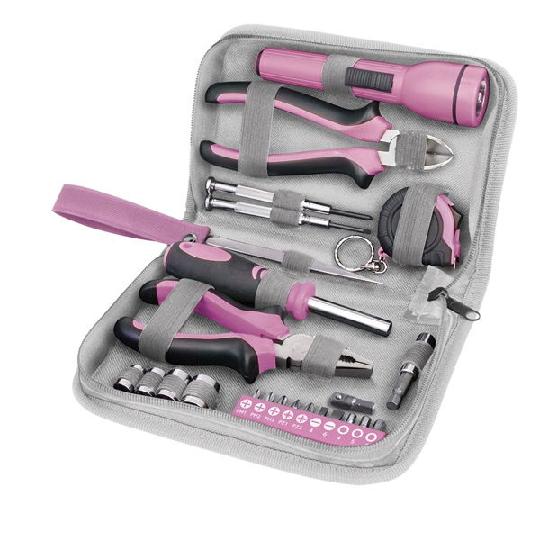 szerszámkészlet, 23db, 1/4"; Extol Lady, rózsaszín, 4 dugófej (6-12mm), fogók, csavarhúzó markolat, mérőszalag, BIT-ek