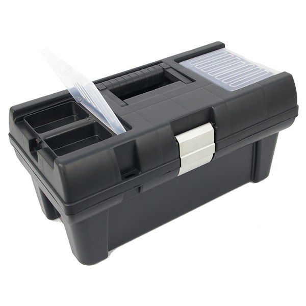 szerszámosláda, műanyag, alucsatos, tálcával, fekete, lakatolható; 16", 415×220×200mm, rendező felül