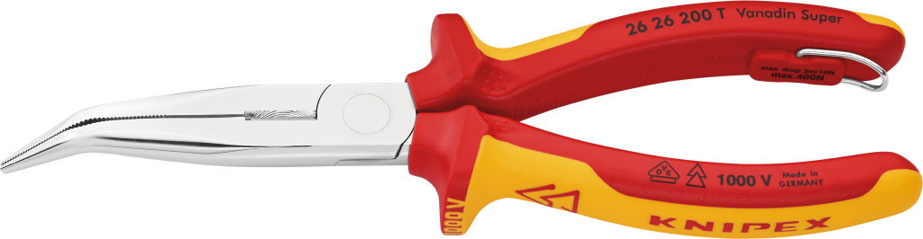 Szigetelt félkerekcsőrű fogó, hajlított, kétk.ny. 200 mm, 40°, vágóéllel, 1000V, leesés ell.bizt.