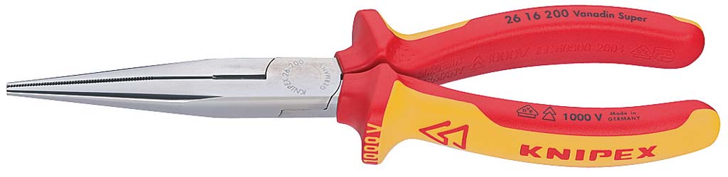 Szigetelt félkerekcsőrű fogó, hosszú csőrű 200 mm, vágóéllel 1000V, kétkomponensű nyél