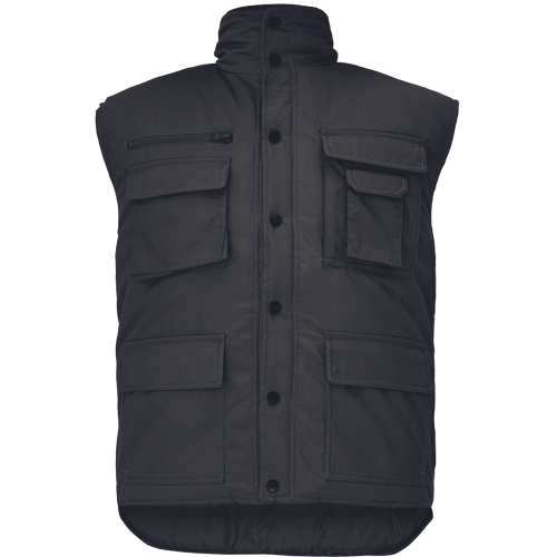 • bélelt mellény állógallérral • hosszított hátrész • műanyag patentokkal