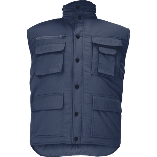 • bélelt mellény állógallérral • hosszított hátrész • műanyag patentokkal