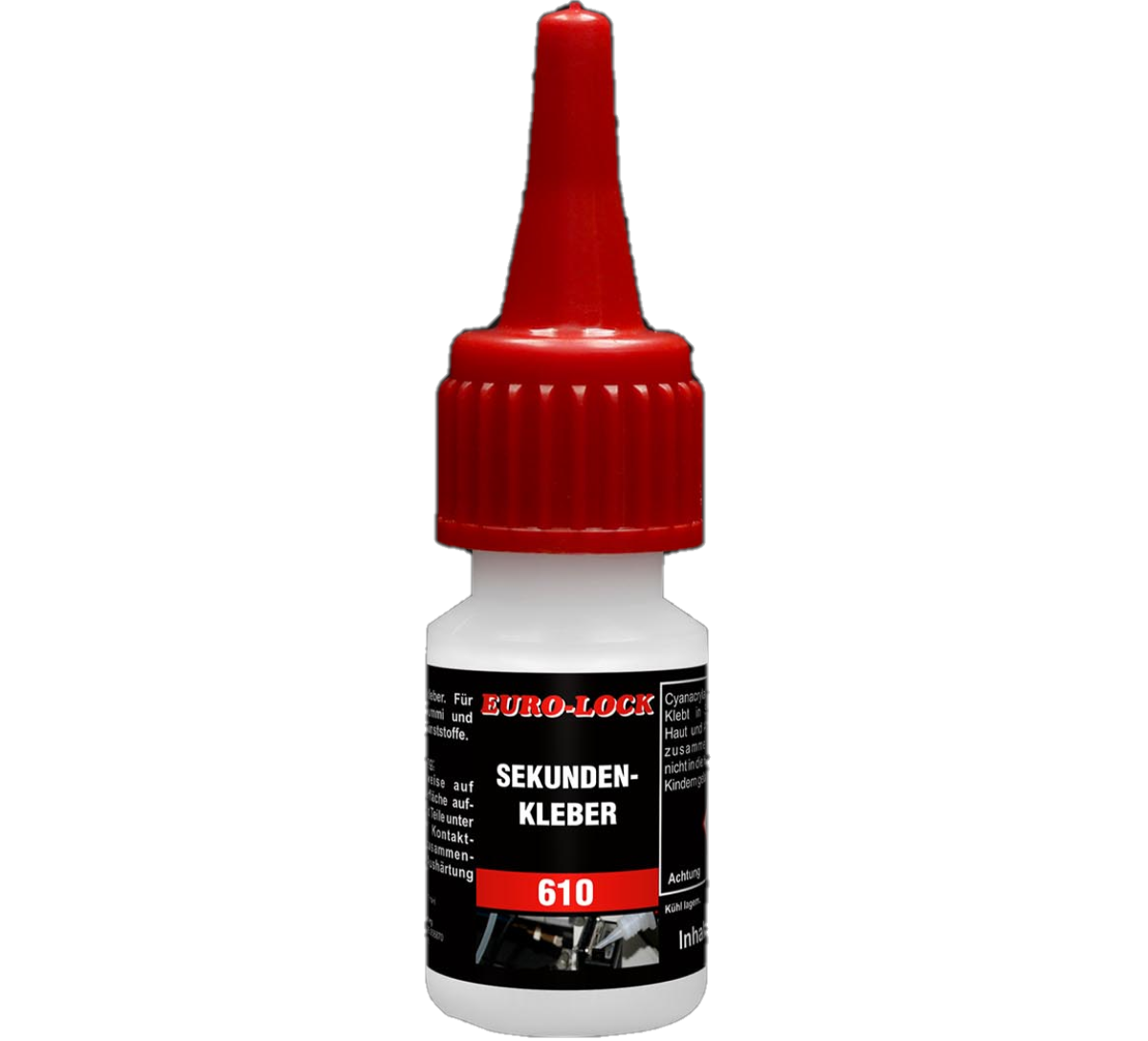 Az EURO-LOCK E 610 egy nagyon univerzális cianakrilát ragasztó. Tulajdonságok:Formája: színtelen folyadékKémiai bázis: etil-cianoakrilátRagasztási hézag: porózus anyagok: kb. 0,25 mm, nem porózus anyagok: kb. 0,1 mm.Szavatossági idő: 6 hónap szobahőmérsékleten, 12 hónap +2°C - +10°C-on.Fajlagos sűrűség (25°C): 1,05 g/lViszkozitás (25°C): 80-120 mPasVégső kikeményedés: 12 óra. Ragasztási sebesség:EPDM: 7 sec.Neoprén: 7 mp.Nitril gumi: 7 mp.Balsa: 10 sec.ABS: 10-20 sec.Polikarbonát: 60 sec.Acél: 25-40 sec. Nyírószilárdság:Acél: 15 N/mm²Alumínium: 10 N/mm²Nitrilgumi: 10 N/mm²Polikarbonát: 6 N/mm²ABS: 6-10 N/mm² Szakítószilárdság:EPDM: 2,5 N/mm² Nitril gumi: 10 N/mm²Nitrilgumi: 5 N/mm²Neoprén gumi: 5 N/mm² AlkalmazásA cianoakrilát ragasztókat cseppenként kell alkalmazni cseppentős flakonból vagy adagolóból. A felhordás után a ragasztandó felületet enyhe érintkezési nyomás alatt illessze össze. A ragasztó polimerizációja néhány másodperc múlva megkezdődik, és a munkadarabok azonnal megmunkálhatók. Az optimális környezeti hőmérséklet a ragasztáshoz +20° és +25°C között van, 50-60% relatív páratartalom mellett.Nagy hidegben a kikeményedés sebessége nagyon lassú lehet. A HPDE tartályok nem biztosítanak teljes zárást. A terméket más vegyszerektől és nedvességforrásoktól távol kell tárolni.Erős fénynek való kitettség kifehérítheti a termékeket! A megfelelő ragasztás előfeltétele a tiszta felület. A felületeket meg kell tisztítani az olajtól, zsírtól és szennyeződésektől.