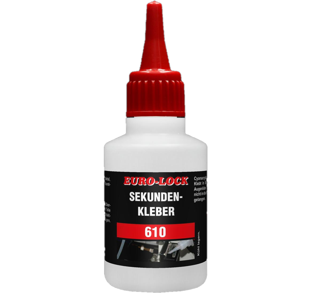 Az EURO-LOCK E 610 egy nagyon univerzális cianakrilát ragasztó. Tulajdonságok:Formája: színtelen folyadékKémiai bázis: etil-cianoakrilátRagasztási hézag: porózus anyagok: kb. 0,25 mm, nem porózus anyagok: kb. 0,1 mm.Szavatossági idő: 6 hónap szobahőmérsékleten, 12 hónap +2°C - +10°C-on.Fajlagos sűrűség (25°C): 1,05 g/lViszkozitás (25°C): 80-120 mPasVégső kikeményedés: 12 óra. Ragasztási sebesség:EPDM: 7 sec.Neoprén: 7 mp.Nitril gumi: 7 mp.Balsa: 10 sec.ABS: 10-20 sec.Polikarbonát: 60 sec.Acél: 25-40 sec. Nyírószilárdság:Acél: 15 N/mm²Alumínium: 10 N/mm²Nitrilgumi: 10 N/mm²Polikarbonát: 6 N/mm²ABS: 6-10 N/mm² Szakítószilárdság:EPDM: 2,5 N/mm² Nitril gumi: 10 N/mm²Nitrilgumi: 5 N/mm²Neoprén gumi: 5 N/mm² AlkalmazásA cianoakrilát ragasztókat cseppenként kell alkalmazni cseppentős flakonból vagy adagolóból. A felhordás után a ragasztandó felületet enyhe érintkezési nyomás alatt illessze össze.A ragasztó polimerizációja néhány másodperc múlva megkezdődik, és a munkadarabok azonnal megmunkálhatók. Az optimális környezeti hőmérséklet a ragasztáshoz +20° és +25°C között van, 50-60% relatív páratartalom mellett.Nagy hidegben a kikeményedés sebessége nagyon lassú lehet. A HPDE tartályok nem biztosítanak teljes zárást. A terméket más vegyszerektől és nedvességforrásoktól távol kell tárolni.Erős fénynek való kitettség kifehérítheti a termékeket! A felületeket meg kell tisztítani az olajtól, zsírtól és szennyeződésektől, javasoljuk aLos 2000ipari tisztító használatát!