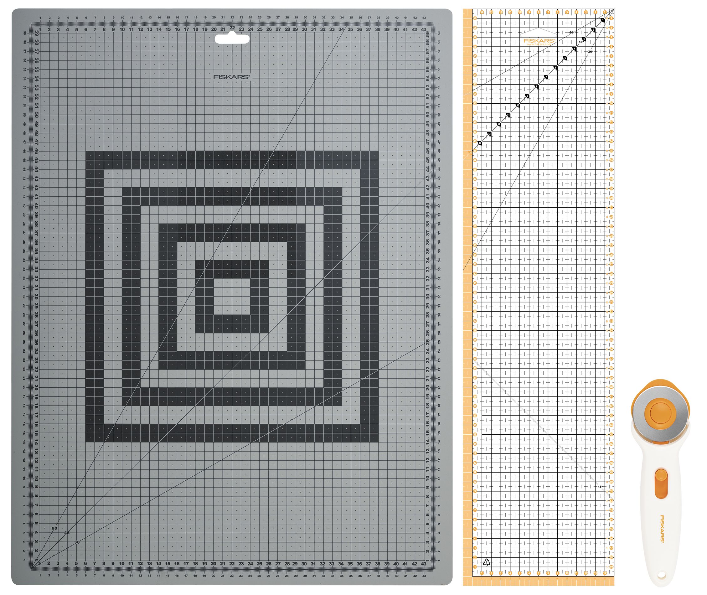 • A Fiskars varrási kezdőkészlet egy forgóvágót, vágószőnyeget és varróvonalzót tartalmaz.