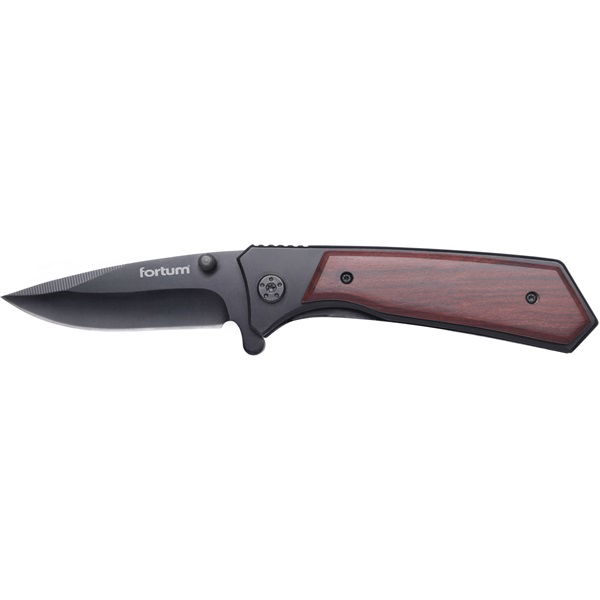 zsebkés, rozsdamentes fekete pengével, teljes/összecsukott hossz:205/120mm, pakkafa nyél, övre akasztható, rögzítővel